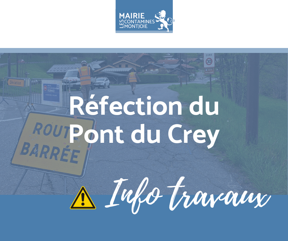 Pour améliorer la sécurité et le confort de circulation, le pont du Crey sera en réfection du lundi 6 octobre 2025, à partir de 7h, jusqu’au mardi 7 octobre, 17h.